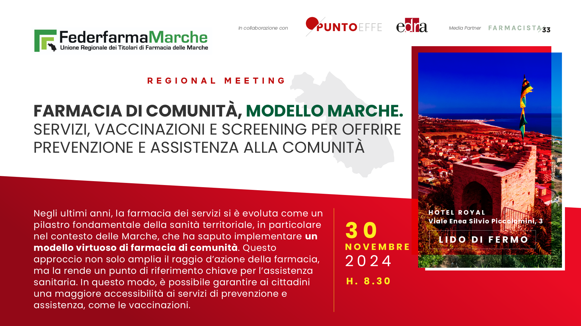Questo evento, realizzato da Federfarma Marche in collaborazione con Edra SpA e Punto Effe e con Farmacista33 come Media Partner, ha l’obiettivo di fare il punto sulla situazione attuale, condividere i dati sull’andamento della farmacia dei servizi, esplorare le nuove prospettive per la vaccinazione in farmacia, e discutere le sfide e opportunità di questo modello. La partecipazione di esperti e rappresentanti istituzionali consentirà di analizzare i risultati finora raggiunti e delineare i prossimi passi per potenziare ulteriormente il sistema di assistenza territoriale.